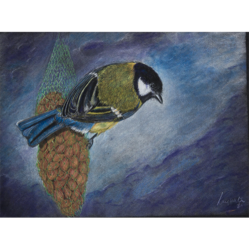 Bluetit on Nuts 28 x 21 cm A4 Pencil on Pastel Mat